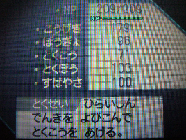 MAP広くて半場諦めモードです。 夜中に大体2時間程度ですが、毎日やっておりまして 昨日からランダムマッチにちょくちょく潜り始めました。 またパワーアイテムも全部揃ってませんが、2匹ほど選定しました。 ⇒フリージオ、ハハコモリ (手段があれば、画像を後で貼りたい) 選定したらとりあえず使いたくなるわけで。。。 適当に前のBWから何匹か送り込んでPT組んでみました。 ・バリヤード(エスパー)・・・流し、乱し型 ・ココロモリ(エスパー・飛行)・・・変なアタッカー、実は両刀、そして壁も張れる ・ハハコモリ(草・虫)・・・変なアタッカー ・ハガネール(鋼・地面)・・・ただヴィジュアルが好きなだけ。バランスみて投入 ・フリージオ(氷)・・・ドラゴンバスター ・ルンパッパ(水・草)・・・自律雨すいすいアタッカー、相棒 非常にバランスが悪いPT まず炎、格闘、悪、ゴースト技などがひとつもありません。 <潜ってみての> \\ドラゴンが多いですね。食物連鎖が成り立ってないんじゃないのかな? 恐竜のように隕石落として滅ぼしてやりたいんですけど、、、でも何故かこっちにばかり隕石が落ちてきます。 反則ですね。 \\ナットレイが出てきたんですけど、炎、格闘技を使えるポケモンがいなくてやられました。 次はそこらへんの技が使えるポケモンを選定しようかな・・・ \\実際出てくるポケモンは大体決まっているかんじでしたけど、あまり見かけないPTみるとワクワクして楽しいです。 「え~、こいつは何使ってくるんだ。。てか特性なんだ。。?」 \\ルンパッパに頼りすぎ。だけど入れないと勝てる気がしない。 ココロモリ、ハハコモリのみで勝ったときが一番うれしかったですねぇ。 ということで4勝、4敗で終了。久しぶりだったので、ドキドキしました。 やるからには勝ちたいですが、負けても選定したばかりのポケモンの見せ場があれば満足してます。 最後に同居している友達と1戦だけしたのですが、軽く打ちのめされました。 次は負けない(涙) さて何を選定しようかな。。 |